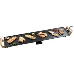 Die Elektro Plancha Grillplatte ABP603 von Bestron ist eine große hochwertige Backplatte mit Antihaftbeschichtung (Grillfläche 70 x 23cm), sie eignet sich besonders für z.B. Fleisch, Fisch, Gemüse oder Kartoffeln. Zum Grillen ist kein Öl oder Fett nötig. Eine Auffang-Rinne und -Schale nehmen überschüssiges Fett oder Grillrückstände auf. Die Plancha kann im Innenbereich und wettergeschützt im Freien verwendet werden. Der abnehmbare einstellbare Temperaturschalter ist mit einer Kontrollleuchte ausgestattet. Die leicht zu reinigende Plancha ist außerdem mit wärmeisolierten Griffen und Antirutschfüßen versehen.Art.-Nr.: 1535980