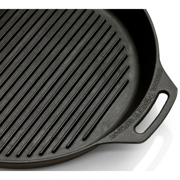Die gusseiserne Petromax Grill-Feuerpfanne gp30 gehört mit ihrer exzellenten Wärmespeicherung zur Ausstattung jeder Küche. Sie ist für das Zubereiten von Fleisch, Gemüse und Co. mit dem besonderen Grillaroma ideal, da sich die Hitze in Gusseisen gleichmäßig verteilt und lange gespeichert wird. Die Rillen am Pfannenboden geben dem Bratgut nicht nur das typische Grillmuster, sondern ermöglichen auch besonders fettarmes und gesundes Braten. Ob in der Draußen-Küche über dem offenen Feuer gekocht wird oder auf dem Herd zuhause, man kann die Feuerpfanne sowohl auf herkömmlichen Herdplatten, auf Gasflammen, im Backofen als auch im Freien auf einer Kochstelle, über einem Lagerfeuer oder auf einem passenden Grill verwenden. Das Gusseisen mit seiner ausgezeichneten Wärmeverteilung und -speicherung ist dank der vorbehandelten Oberfläche (seasoned finish) sofort einsatzbereit und leicht zu pflegen.Art.-Nr.: 1532904